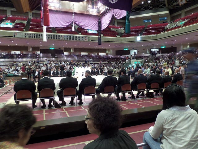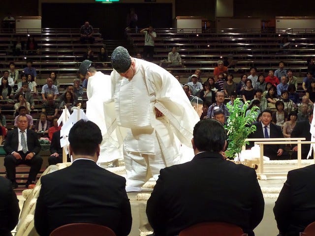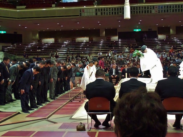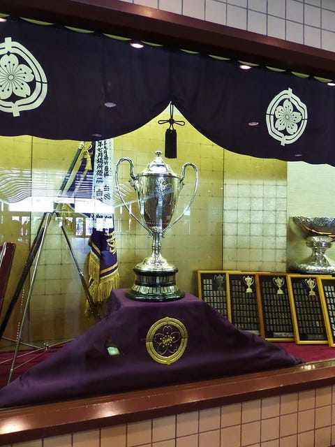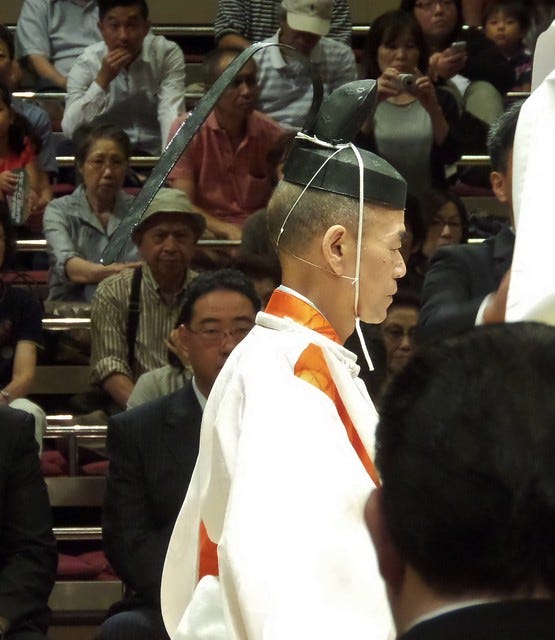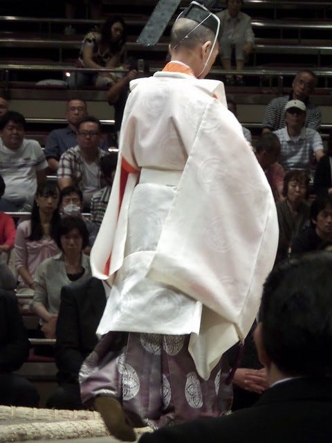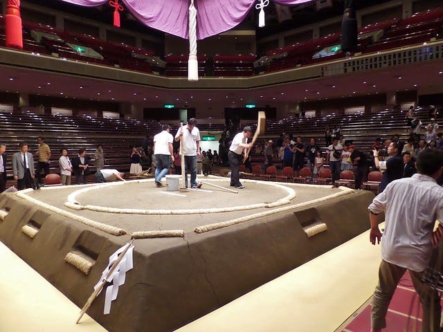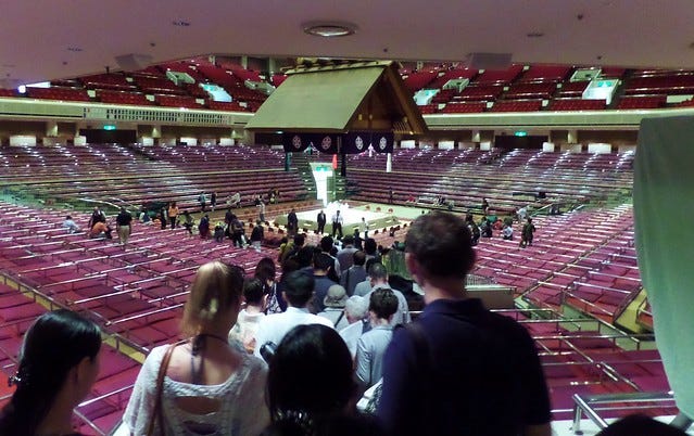 The roof suspended over the ring resembles a Shinto shrine, emphasising the serious nature of the event. This isn't just fat guys grappling - this is a serious profession with many spiritual elements.