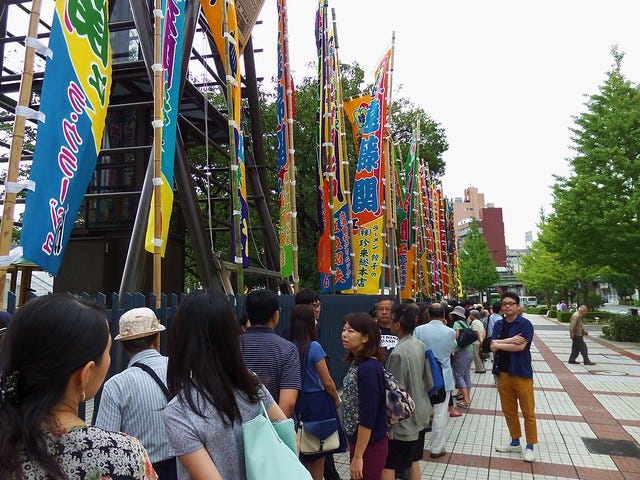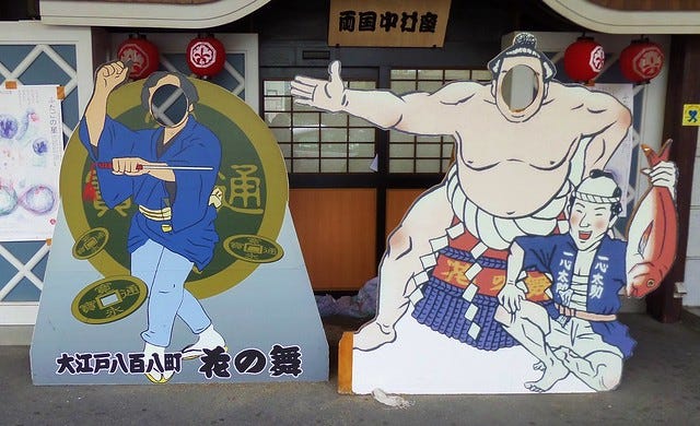 Last Saturday was the opening ceremony of the current Sumo tournament. There are 6 each year - 3 in Tokyo and 3 in other major Japanese cities. I missed the June one so as soon as the tickets went on sale for this month I was online. Pooch and I are going this weekend so this opening ceremony was a kind of warm up for me! The venue is next to Ryogoku station, which is therefore suitably decked out with the appropriate face cut out.