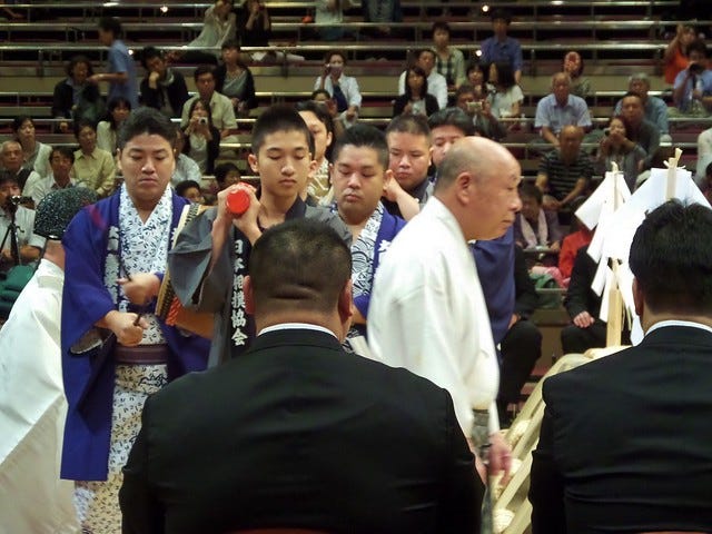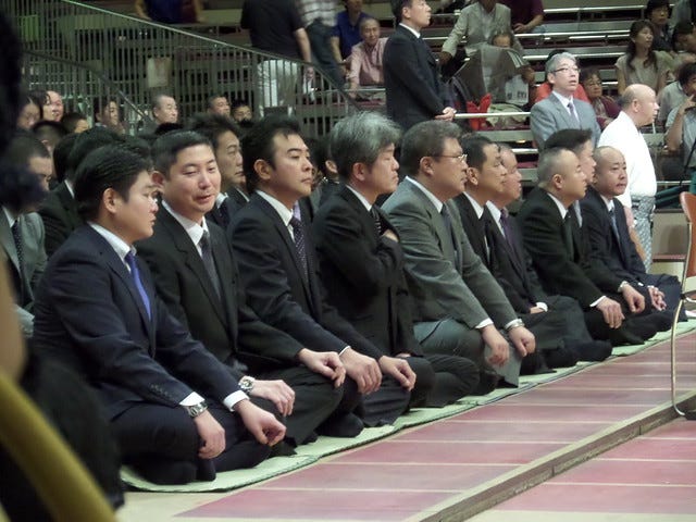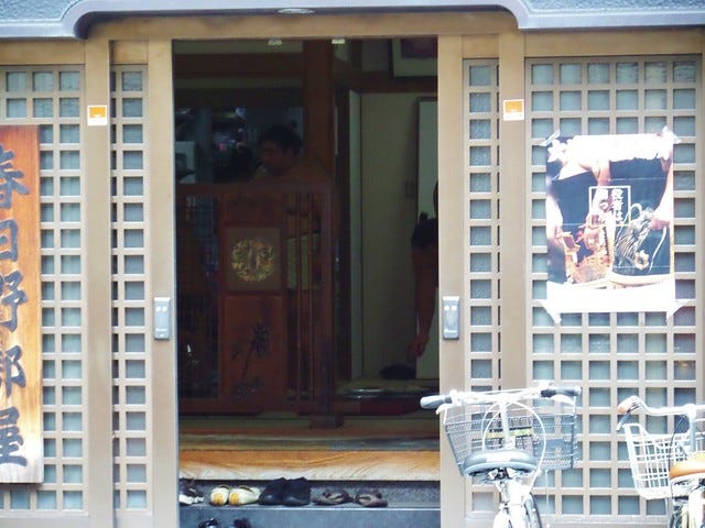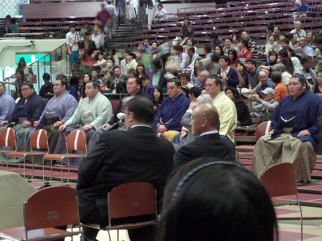 In all there are 47 training stables which contain roughly 640 wrestlers. The most junior have to get up at 5am and as well as training are servants to the senior ones. Wrestlers of any rank are only allowed to wear traditional japanese yukata and wooden shoes and have to obey a huge slew of rules. According to wikipedia, after one top guy was in a bad car accident they were forbidden from driving their own cars. That might be testicles but it could equally be quite true.
