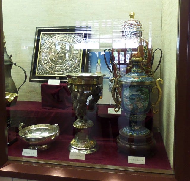 However, it isn't just the one trophy. Coca Cola gives a huge silver coke bottle. The Czech Republic gives a large crystal bowl. Lots of people give other bits and bobs. Everything in the case represents the trophies for just this tournament (I think - possibly for the year. It's difficult to be certain when all the labels are in japanese.)