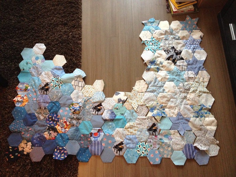 It is in three pieces at the moment and it is the top right piece I am currently working on, working vertical strips and joining them to grow it from right to left. This is the quilt I am making for my Mum and she chose a lot of the fabrics, which were all fat eighths at most in size. The pieces have 3" sides and I made all the pieces while I was in Tokyo last year. This is my design...