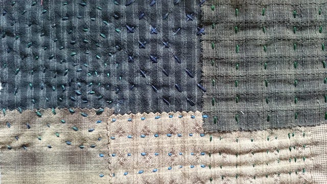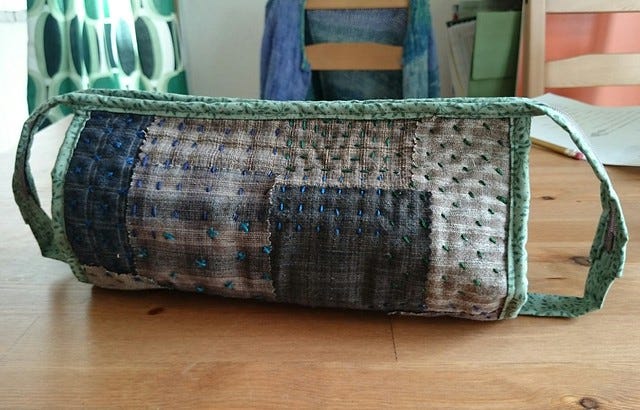 I mentioned in Thursday's post that I had made another 'Sew Beautiful' bag using some sashiko embroidery. Sashiko is the japanese word for 'little stabs', not to be confused with 'chiku chiku' which is the onomatopoeic phrase for sewing - chiku is said to be the noise the needle makes when it goes in and out of the fabric to form one stitch. The japanese are very keen on onomatopoeia. When I had finished the fabric I intended to use for the outside I had a strong urge to leave it as it was and frame it or something.