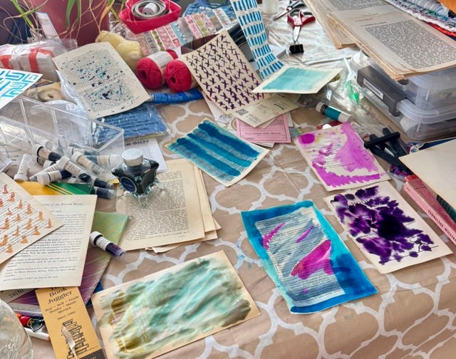 I have a tendency to get all up in my head about creativity and so I relish opportunities to create without thinking about it too much. There is a book coming out soon called “Inside the Box: How Constraints Make Us Better” by David Epstein, who’s substack I read. I find it easiest to create when I limit myself to a set of materials, such as old book pages and ink.