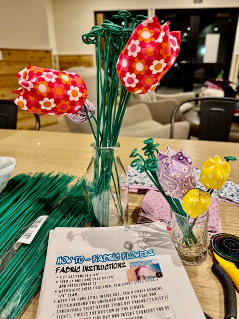 Having cxreated the instructions for the Retreat, I wanted to also share them with you here. I think they’re rather adorable and intend to make a huge bouquet rather than stopping at the six shown here. The 2nd page of the PDF gives the three sizes and you can use floral wire (I used these) or a skewer or chopstick as the stem. You could also easily add leaves too should the spirit move you.