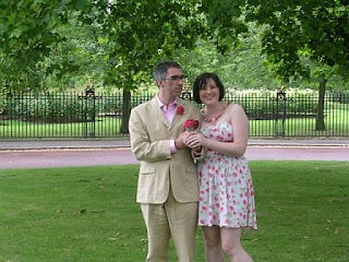 Next up is the happy couple, with me still chortling away. Pooch's buttonhole was also knitted.
