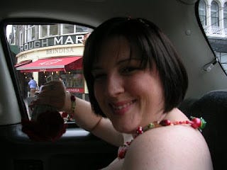 This is me in the taxi chortling away on the way to the registry office. The murky lump in my hand is my knitted bouquet.
