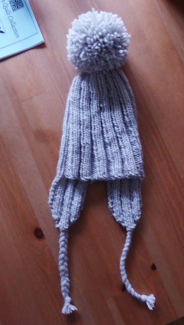 The cardigan is based on a french design that was only available for three year olds. So I adapted a Drops pattern and it came out ok. The only thing is the bow is a bit droopy. I might need to move the fastening to change that. Details on ravelry here. The hat is uber stretchy and has those cords to stop the little bugger pulling it off. Details on ravelry here.