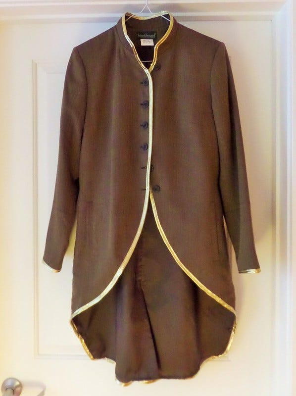 The original coat was $11 in a thrift shop plus about $6 for two packs of gold bias binding. I was wondering whether to do some more and sell them on Etsy but you never really know whether this stuff will sell. And how much should be charged? Being second hand the coat wasn't in A1 condition to start with - more like B2 - but it is definitely good enough for a couple of weeks in the desert. It gets very cold at night, so they tell me.