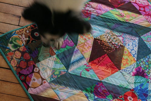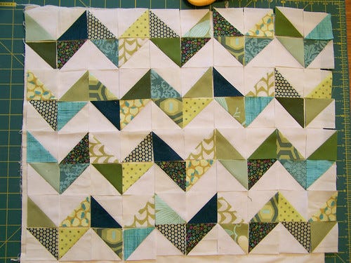 While you ponder I wanted to share this cunning way to get four half square triangle patches out of two charm squares. There are some nice examples of quilts you can make from them on Flickr.