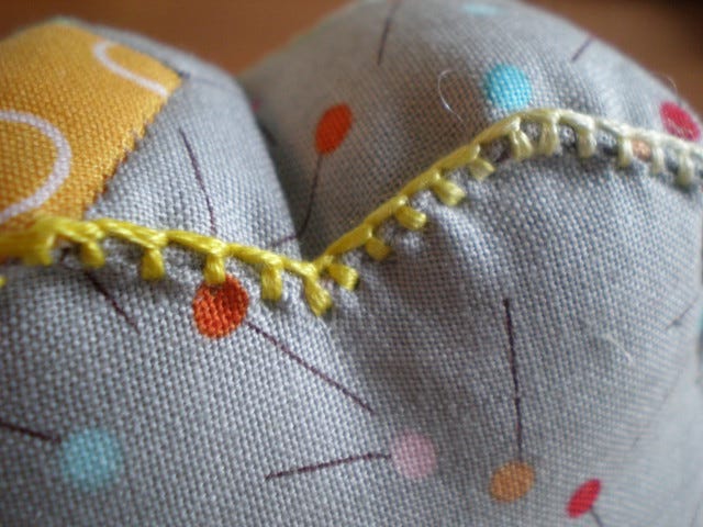 It has come out a little pouf-ier than desired as my stuffing was extremely springy. I incorporated some left over hexagons into the sides and then did a little blanket stitch to define the top and bottom.