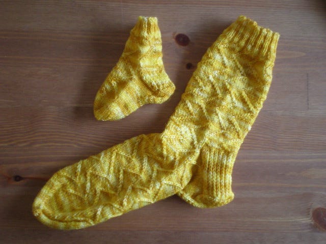 In fact I enjoyed it so much that having finished the main pair (for my sister) I had enough yarn left to do a baby pair for ickle Jasmine. Mother and baby socks - what every mother needs!