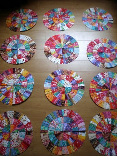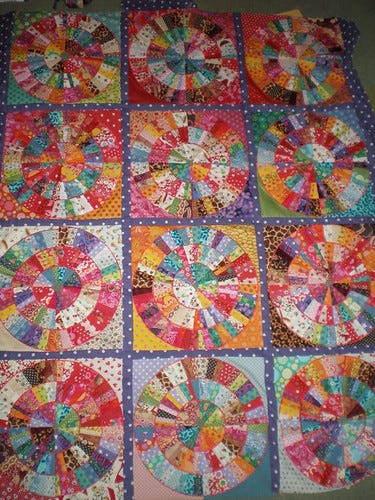 Hundreds of tiny pieces of fabric, acquired over years and in some cases decades, stitched together and gradually built up into larger blocks. This week the larger blocks were finally joined into one big quilt front.