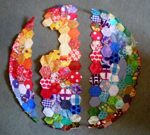 This is actually called the "Nearly Insane" quilt and I came across it on Faberdashery's blog where she is english paper piecing one in just red and white. Looks AMAZING. I immediately started combing the internet for the pattern and reading what others had written about it and studying their colour schemes and thinking how I would approach it. Insane. Although Faberdashery did rock my world slightly by using EPP for the whole quilt. She points out EPP isn't just for hexagons and she is quite right but I had never thought of doing a half-square triangle block that way. Another great example of how inspiring sharing via blogs can be.