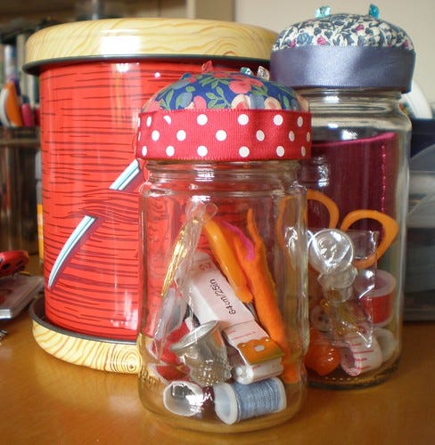 And I have put things in jars and then put a pin cushion on top plus some ribbon.