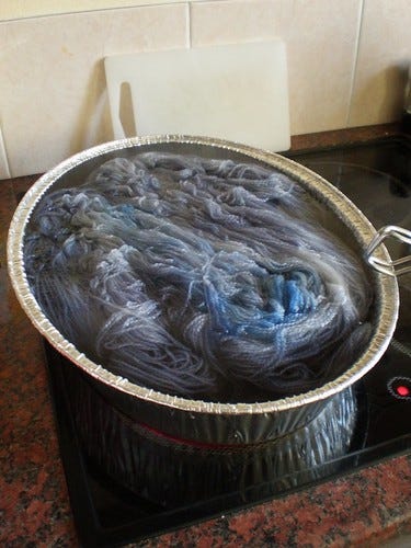 My next little endeavour was dyeing the yarn for my cloud jumper. I had dyed samples of an aran weight but have ended up with 4-ply. I'm also considering intarsia instead of fairisle to make it less bulky. I've unvented (in the Zimmermann sense) a way of doing intarsia in the round. I need to experiment to see if it will work properly though.