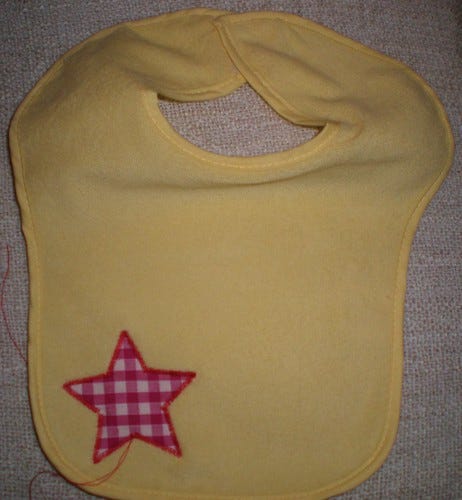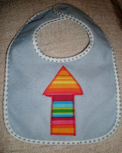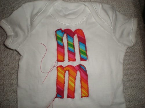 So. Right. Not to be put off I switched to just cutting freezer paper, which did indeed cut like a soft foodstuff. I then ironed the freezer paper shapes onto fabric, cut round them and glued (yes, glued) them onto bibs and onesies.