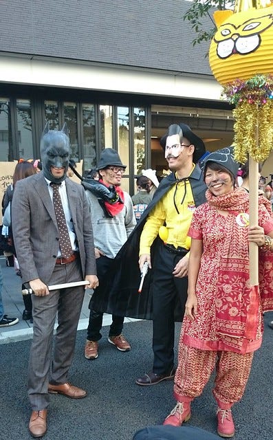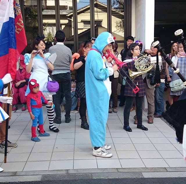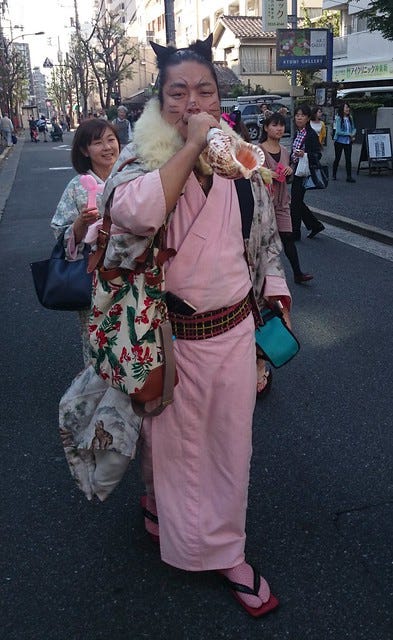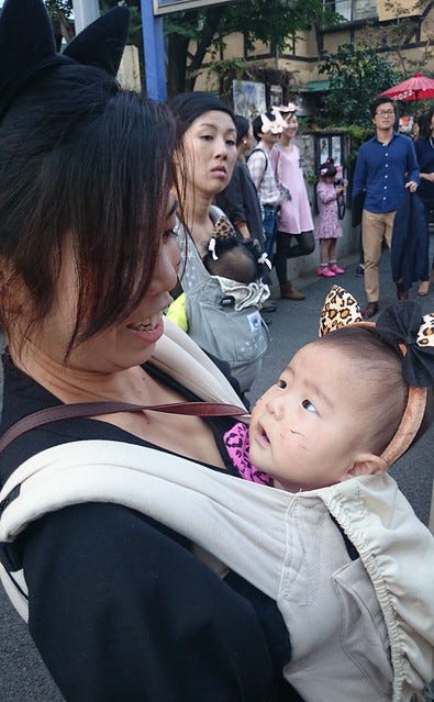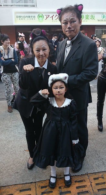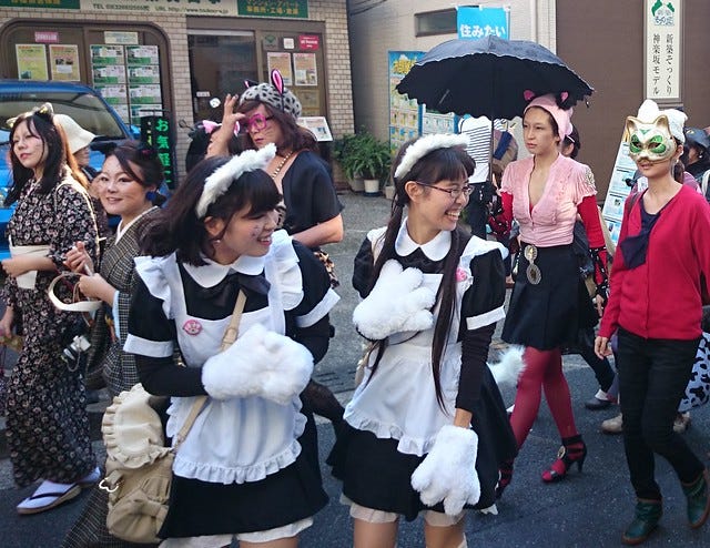 Sunday saw Pooch and I at the Kagurazaka Bakeneko Cat Parade near Iidabashi (pronounced Ee-der-bashy). I went for the black cat look, complete with ears.