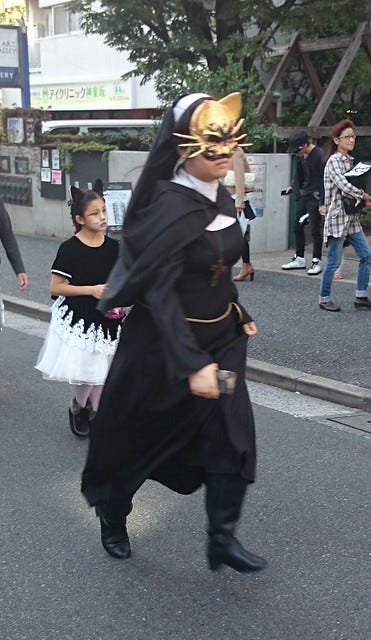 A running nun cat, catching up with the end of the parade.