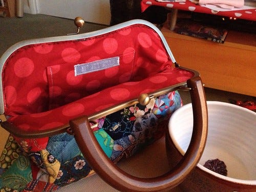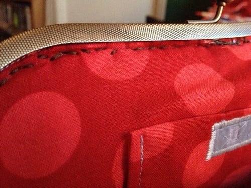 The handle being on just one side means it is liable to flop open if there is too much in it. Whch there will be because it's not big enough for even my minimum swag. Plus, behold the reason I hate sew in frames.