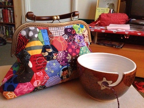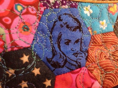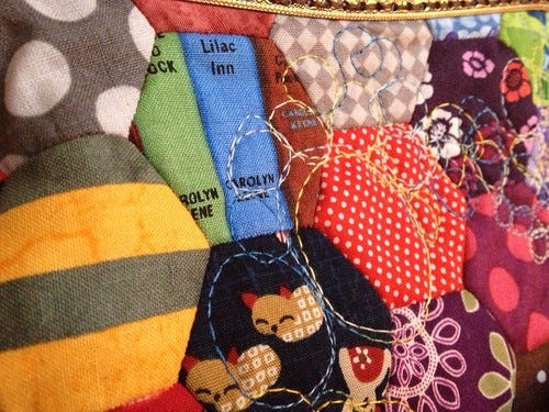 ...I really do rather love it. Hand sewn hexagons with my favourite pebble style machine embroidery on top.