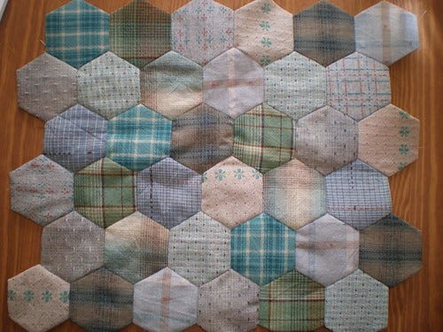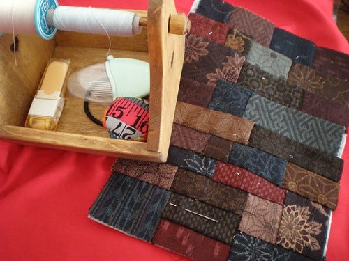 This uses the bundle of Japanese cottons I bought at the Quilt Show last month which looked blue together but which are definitely more green when pieced like this. I do adore this type of fabric which doesn't seem to have a name in Japan. The cotton is thicker than quilting cotton with a slightly brushed effect which makes it feel very soft. The patterns are woven rather than printed which also increases the bulk where there is a feature such as a flower (top row, 3rd from the right) or a dot (second row, 1st on the left). These features also give it a lovely texture and the colours are all very dusty and muted. Beautiful. I have also been hand sewing the roof of the little 'house' sewing box I also got at the quilt show.
