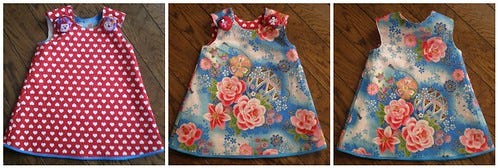When I make another one (I just need to be sure this one fits) I won't use such bulky buttons as having them on both sides means the dress will stand away from her little collar bones. I think next time a couple of those iron on patches will serve to disguise where I've sewn on the poppers instead. But apart from that I am very happy with this. My sister is very lovely and an excellent mother but useless at measuring her child so I just did it based on the average for her age, hence my concern about the fit!