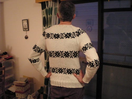 He's gone all shy in his 37th year but still has the bum of a 35 year old, n'est pas? He's very happy with it. I used the free chart from here (Rav link). I also finally sewed the buttons I made onto Jasmine's dress.