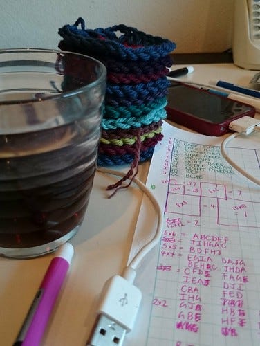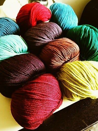 Ten different colours of this lovely 100% wool which I think must be Japanese although the brand is "spectre modem" - I've yet to check it on Ravelry. It's a light aran and machine washable. I've sketched out a plan and combinations of colours.