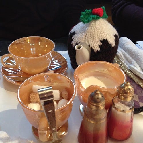 Isn't that tea cosy adorable? We met at the Kimono Bar and Grill which is owned by a knitter and she served us all delicious food as well as using her vintage lustreware for hot drinks. Highly appreciated! Especially as this was rather a nippy day. In case anyone is in the area I recommend the restaurant and the SnB meetings are on Meet-Up.