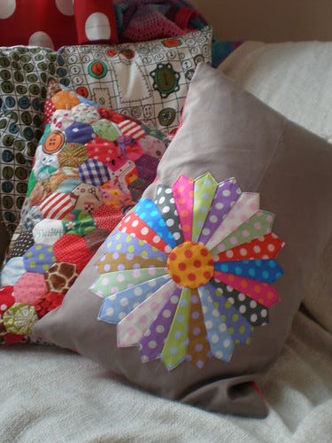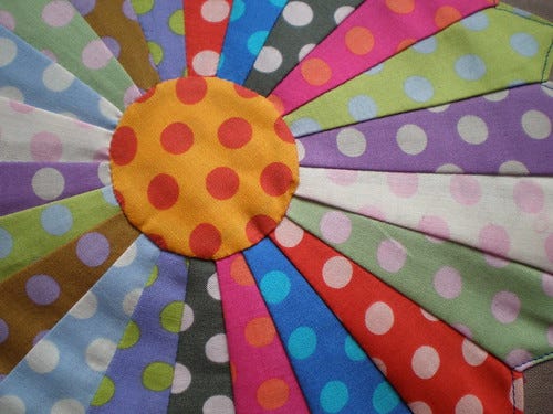 Good day sunshine!This is my first appliqued circle, mentioned in yesterday's post. Not too shabby huh? I cut the circle and then tacked a 3mm hem before whip stitching it down and removing the tacking thread. And it is just the centre of my first ever dresden patchwork piece.