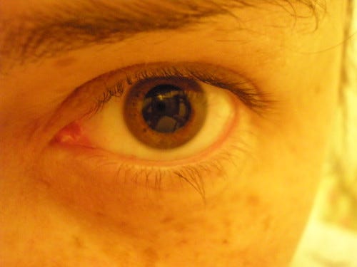 The ol'saucer eyes. Looks kind of spooky huh? It doesn't hurt - although of course I'm more sensitive to bright light - but it does make it harder to focus and so makes you feel a bit spacey. It wears off after a while as well. Just one of those things - but I thought I'd capture it on camera this time.