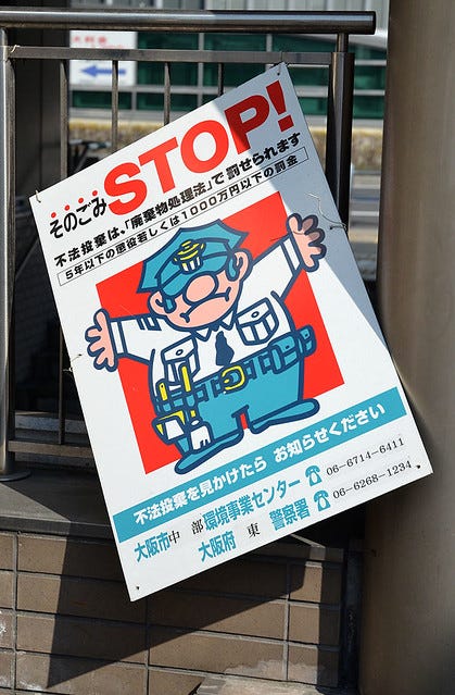 I think most crafters are familiar with the word 'kawaii' as a genre of cutesy japanese craft like amigurumi crochet and hello kitty. It is a japanese word that basically means "cute" and is used extensively by young women. Before I came here I used to pronounce it 'kai-why' but it should be pronounced 'ka-why-ee'. One of the things westerners notice as soon as they arrive is no matter the seriousness of the situation, there is always an opportunity to advertise or warn against it using a cute character.
