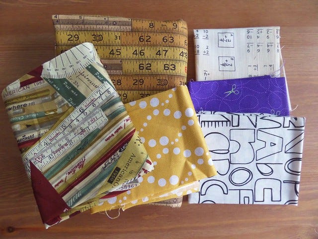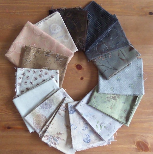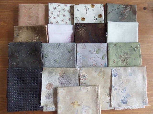 I love these colours. They are so different from what you get in the UK and elsewhere. I was trying to describe the palette to Noriko, who is pukka Japanese but not a quilter, but knew as soon as I used the word 'murky' that I'd failed. I have in mind a dresden quilt but I am just enjoying looking at them at the moment.