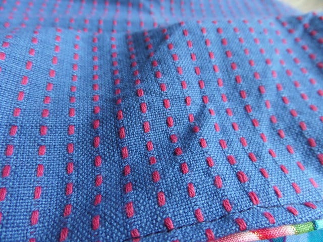 While I was enjoying my moment I realised I'd forgotten to add an inside pocket - but I decided not to cry about it. The lining is these two sashiko-ish placemats I also found at the Sally Army.