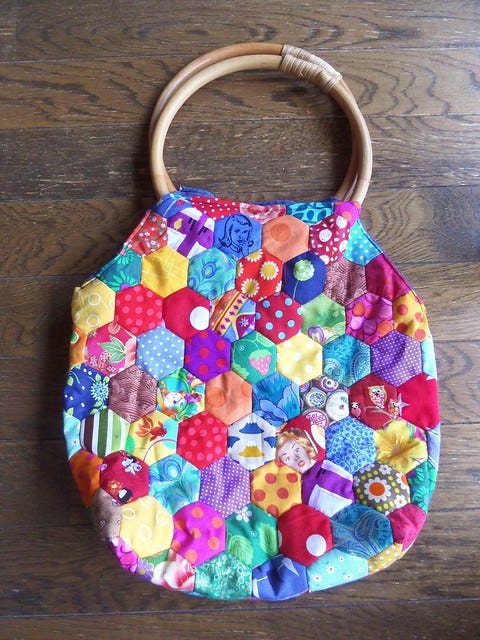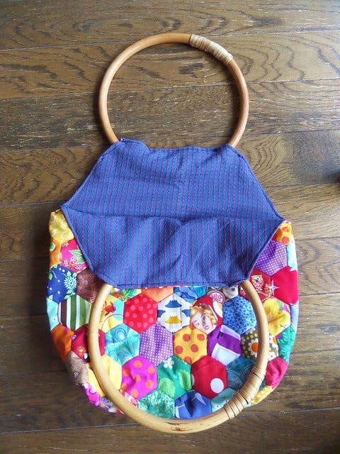 I finished the patchwork (which is on both sides) aaaaaages ago but had been balking at attaching the lining and handles in such a way as to not cock up either. This is my first time using these solid wood handles (I got these secondhand at the Salvation Army Bazaar a month or so ago) and it took a long time for my brain to work it all out to my satisfaction.