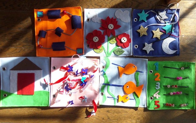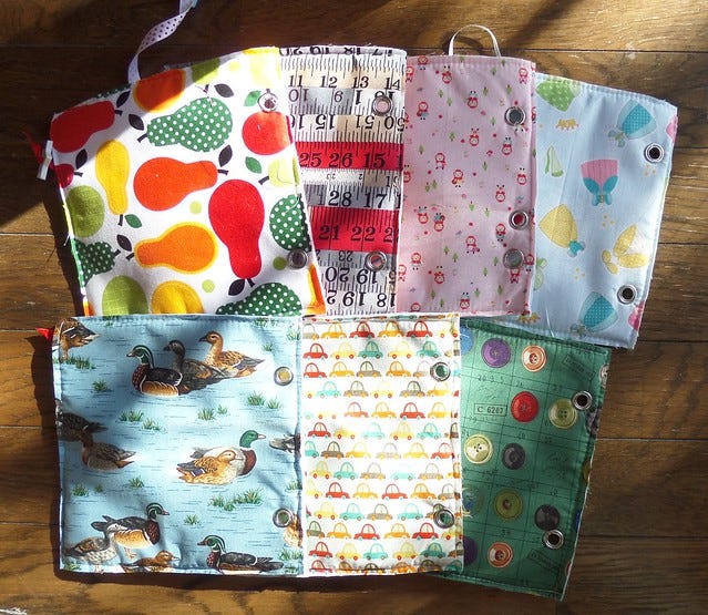 Finally, I finished off those Quiet Book pages I showed yesterday. The fish got their googly eyes, the marble maze was completed but the door never got its button handle.