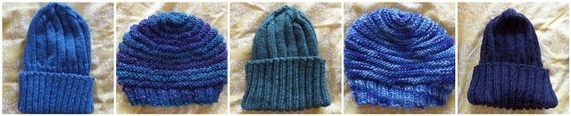 You might suspect I'd only made two and then photoshopped them, but no. I just figured there was no need to use five different patterns if I found just one or two that I liked. Both of these are free and the vertically ribbed one is an authentic WW2 Watchman's hat (Rav link) while the other is the Luuk hat (Rav link) which I really do like the look of. I may make myself one.