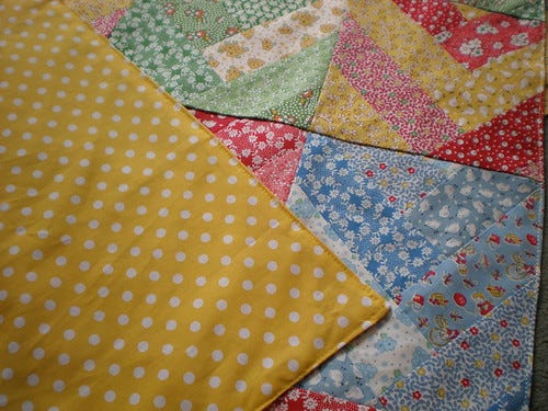 A little cutting and sewing and there you have it! I kept it really simple because I want it to be used and the fussier a quilt is that more in awe people seem to be of using it. I just used a simple cotton polka dot on the back. No quilting. All done.