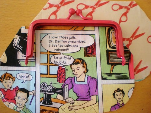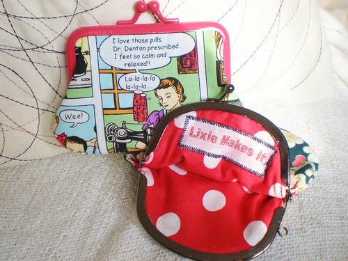Here are all the combinations. This one is for me and actually had an outing last night as a little change purse. The fabric is called "Dysfunctional Family" and I only bought it for this panel, which is one of many.
