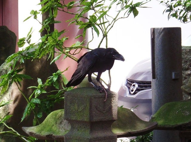 In addition this impressive crow - look at that huge beak - had found a big worm - or maybe a centipede which it was subduing and getting ready to eat. He saw me looking at him and moved to the top of this post before checking to see what I was doing.