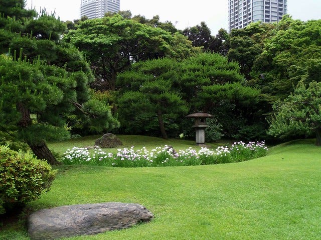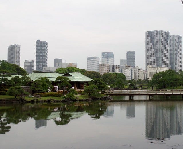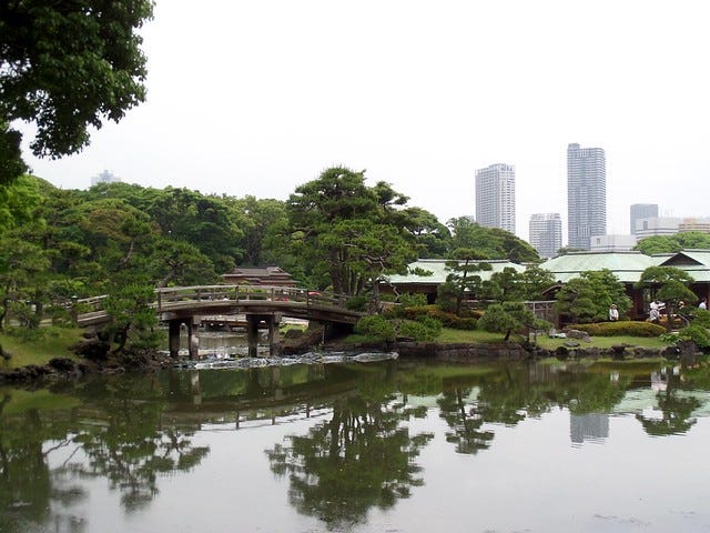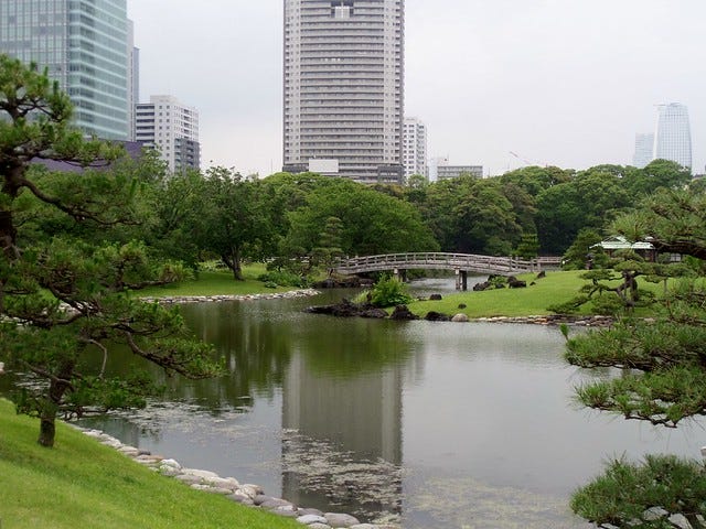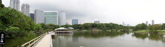 This Garden was originally part of the estate of an Edo period Shogun who ruled in the 1650s. The main pool is tidal and is still fed by the seawater of the bay through two sluice gates. There used to be a villa here and it is where the Shogan would go if he wanted to show off his boats to visitors - in fact it is still used as a dock for one of the river boat services that run in Tokyo. The Emperor gifted the Garden to the city in the 1950s and the tea houses, destroyed during WW2, were very carefully rebuilt in the original style. The garden is now surrounded by high rise buildings (in particular the Conran Hotel) and has a stonking great dual carriageway along one side. Inside it is peaceful and idyllic though. It costs a whopping £2 to get in and I easily spent 2 hours there - I would have spent longer if I'd brought something to eat. Now, I'll just leave you with the photos.