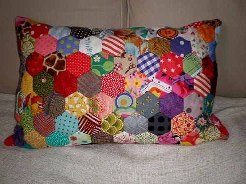 My personal partiality for hexagons is well known (think Nancy Drew Quilt, Crocheted Cat Blanket and Hand Sewn Cushion {below} among other items)...