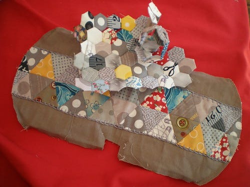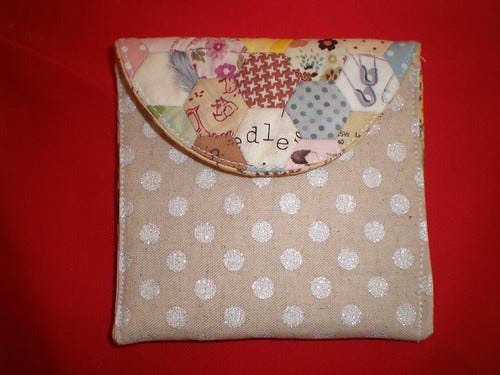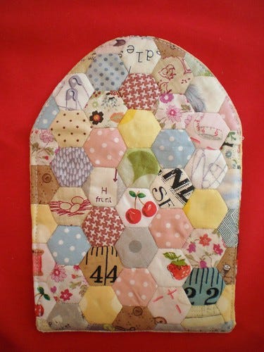 My first pouch was the one I blogged about before that went lumpy. It's now been unpicked and I've created a panel of hexagons to go with the triangles.