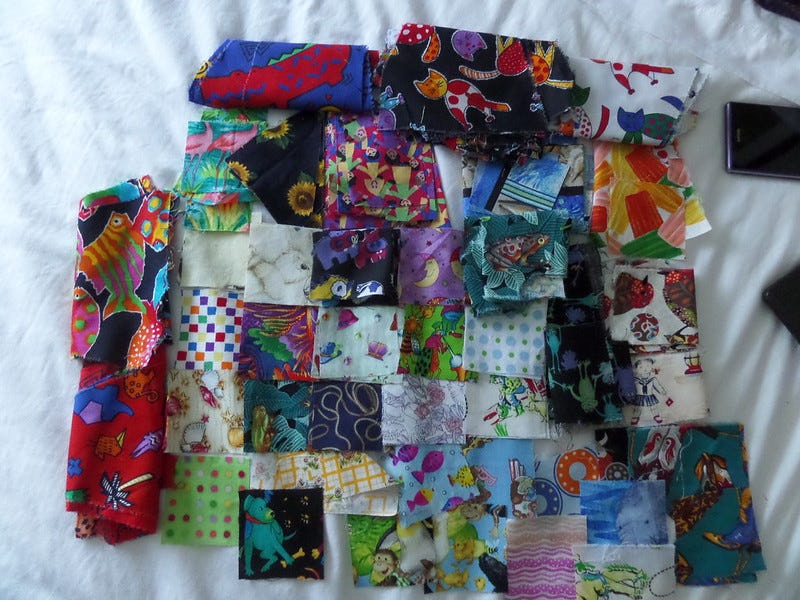 I'll be adding these to my collection of scraps for my niece's i-spy quilt.