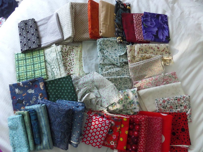Fabric had been washed, ironed and sorted into 1lb bags. I got three plus a few odd FQs. I also got a novelty scrap bag.