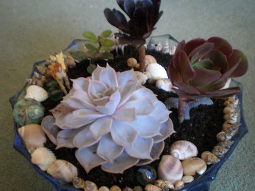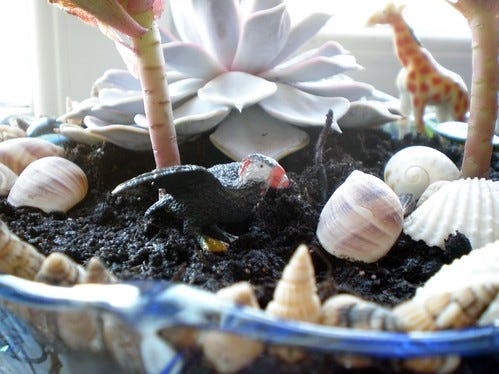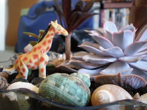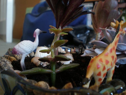 My other project this weekend was finally putting together my succulent garden. I've been planning this for a year now and had been waiting for the growing season to start so I could be sure the succulents would take root properly. I had the Journey to the Centre of the Earth type sets in mind. 1959 I mean, obviously. Only a blurry shot of the whole.