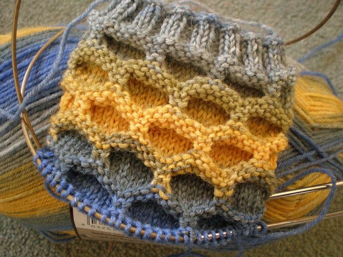 I adore this pattern. It makes any self-patterning yarn look spectacular. I've made it twice for other people but never for myself. Having fallen for this yarn (Opal) in Iknit I knew the two were meant to be together. Loving it. I've been thinking of making a cardigan with the top third in this pattern like this one. Only without the nine freakin' dollars spent on the pattern. $9! For one pattern? Bleh.