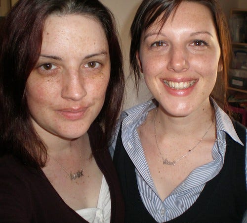 My sister came to stay last night. She is rather more glamorous than I am but it so happened we were both wearing out name necklaces so I felt a portrait was in order.