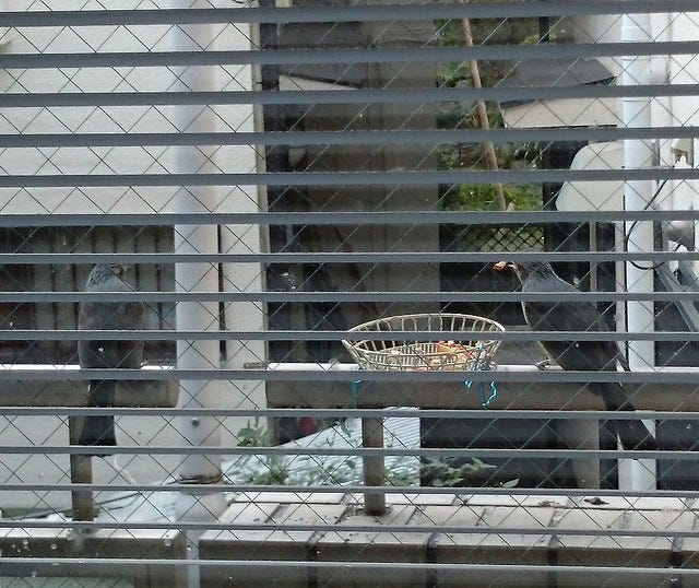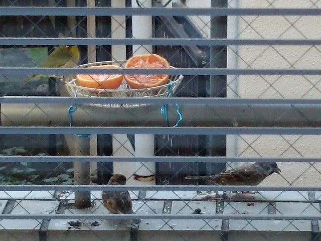 The Bulbuls always make me laugh because they often perch on the balcony outside and sit watching me, as if they are people'rs, in the same way that my Dad is a dedicated birder. I have tried them on various different foods but when it is orange, or a mikan/satsuma, the Japanese White Eyes come to visit. These are the beautiful green birds.
