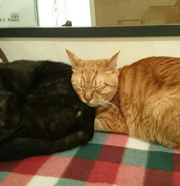 Meanwhile, back at Chez Cat, the colder weather had meant a return to the heating and a number of the cats have been cuddling up together. This is Little Mum and Sonny.